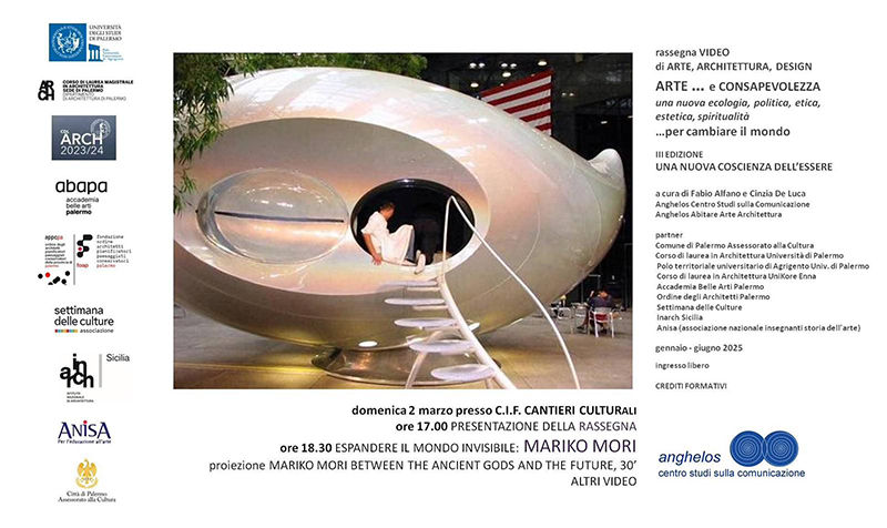 La rassegna di video di arte, architettura, design, quest’anno con il tema ‘Una nuova consapevolezza dell’essere’, prevede 10 incontri/proiezioni su artisti quali Mariko Mori, Marina Abramovic, Anish Kapoor, David LaChapelle, ecc che con la loro arte promuovono un potente messaggio di cambiamento definendo una nuova forma di spiritualità e quindi una nuova ‘dimensione dell’essere’ fondamentale per una reale trasformazione della nostra società.