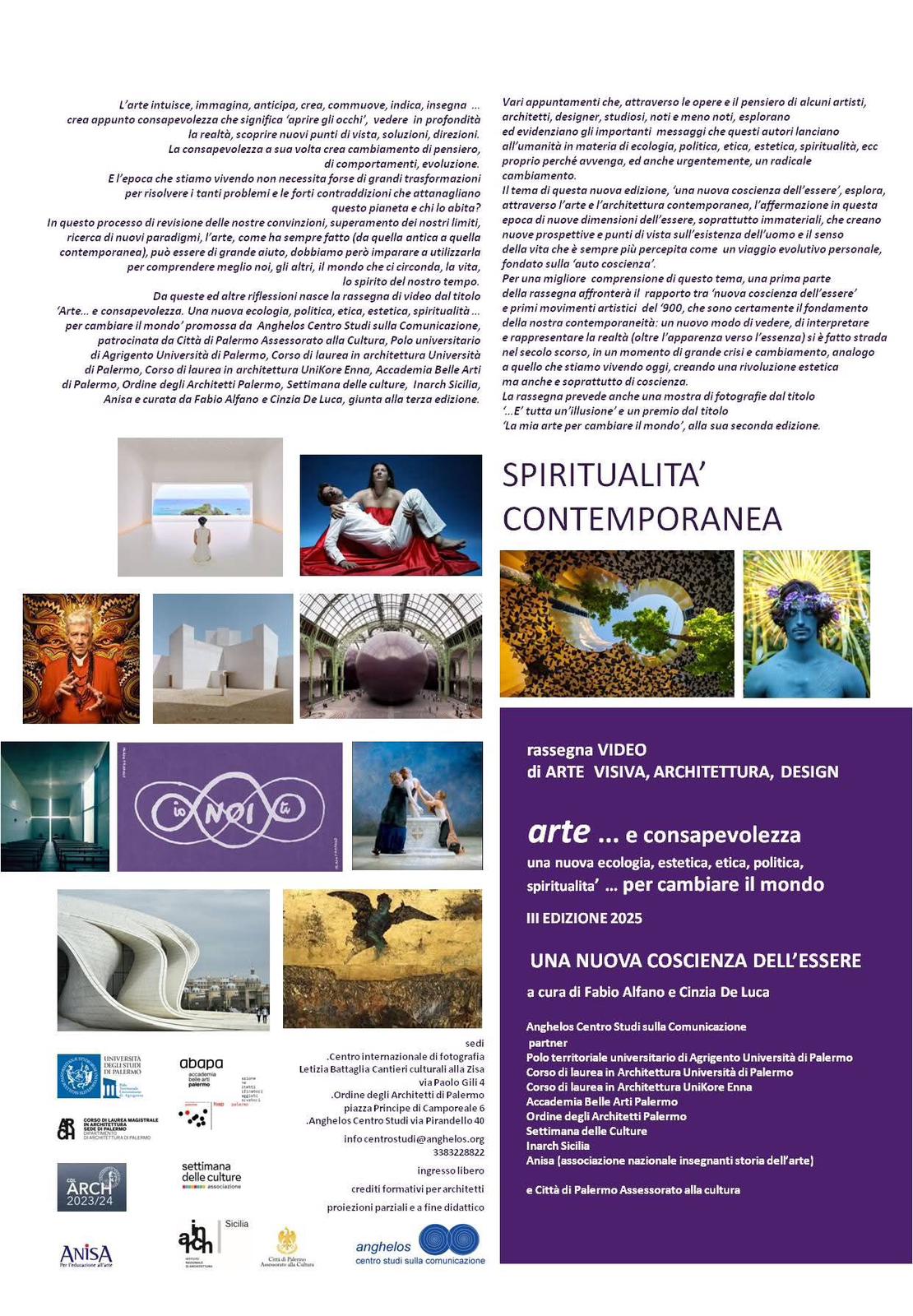 La rassegna prevede anche due omaggi a due grandi artisti recentemente scomparsi, Bill Viola e David Linch, un incontro sul tema ‘Architettura e spiritualità contemporanea’ nella sede dell’Ordine degli architetti di Palermo e un incontro, che unisce arte e scienza contemporanea, che prevede, al Centro studi Anghelos, la proiezione di una conferenza dialogo tra Michelangelo Pistoletto (candidato al nobel per la pace) e il fisico Guido Tonelli.