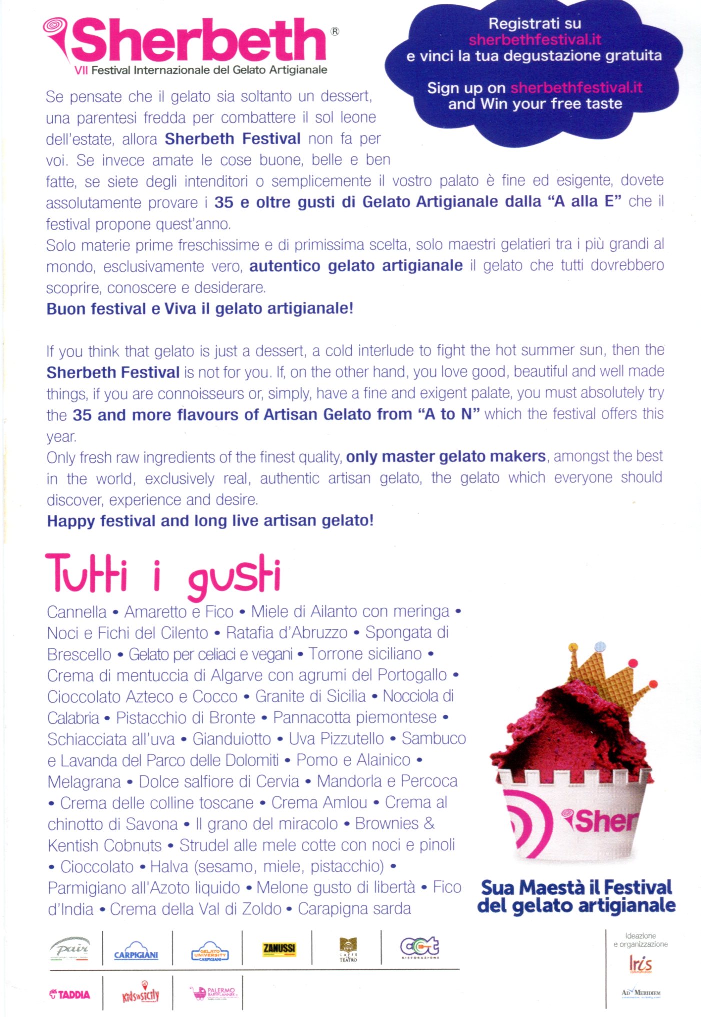 Dopo le edizioni passate svoltesi a Cefalù, per la VII edizione, lo Sherbeth Festival ha scelto Palermo come teatro della manifestazione dedicata al mondo del gelato artigianale. Dal 17 al 20 settembre 2015, nel cuore del centro storico di Palermo, tra via Maqueda, corso Vittorio Emanuele e piazza Bologni, verrà allestito il Villaggio del Gelato, ovvero un laboratorio a cielo aperto, dove saranno svelati i segreti del dolce freddo e dove i maestri gelatieri, provenienti da ogni parte del mondo, esprimeranno la loro creatività nel perfetto rispetto della qualità e dell'artigianalità del prodotto. Inoltre, sarà possibile partecipare a degustazioni, dibattiti, concerti e corsi per aspiranti gelatieri. Sarà predisposto anche uno spazio dedicato ai più piccoli. L'ingresso al villaggio è gratuito, ma acquistando il ticket di degustazione, al costo di 6 euro presso lo Sherbeth Village, si avrà diritto a due coppette e quattro minicono scegliendo su oltre 30 gusti diversi di gelato artigianale, anche per celiaci e diabetici.Ma lo Sherbeth Festival rappresenta anche una interessante occasione per gli artisti emergenti siciliani per potersi esibire e, quindi, sfruttare questa importante vetrina internazionale per presentare i propri lavori artistici. Per questo motivo saranno presenti otto diverse sezioni: Musica (solisti e band che propongono musica inedita); Cover (solisti e band che propongono cover di artisti nazionali ed internazionali); Artigiani; Spettacoli (giovani che sanno intrattenere il pubblico con spettacoli di magia, giocolieri, trapezisti etc.); Fotografia; Installazioni; Pittura e Documentari. Inoltre, per le famiglie e per i turisti, Sherbeth organizza anche tour culturali ed offerte turistiche dedicate, grazie alla collaborazione di Federalberghi, del Consorzio Palermhotels, di Volotea e dell'Associazione culturale Terradamare. Per il programma completo, per registrarsi all'evento e per ulteriori informazioni collegarsi a www.sherbethfestival.it