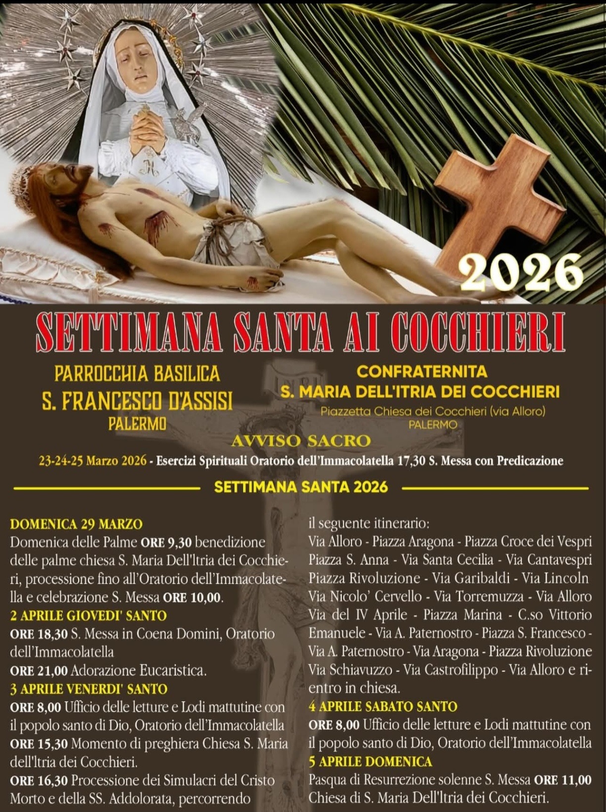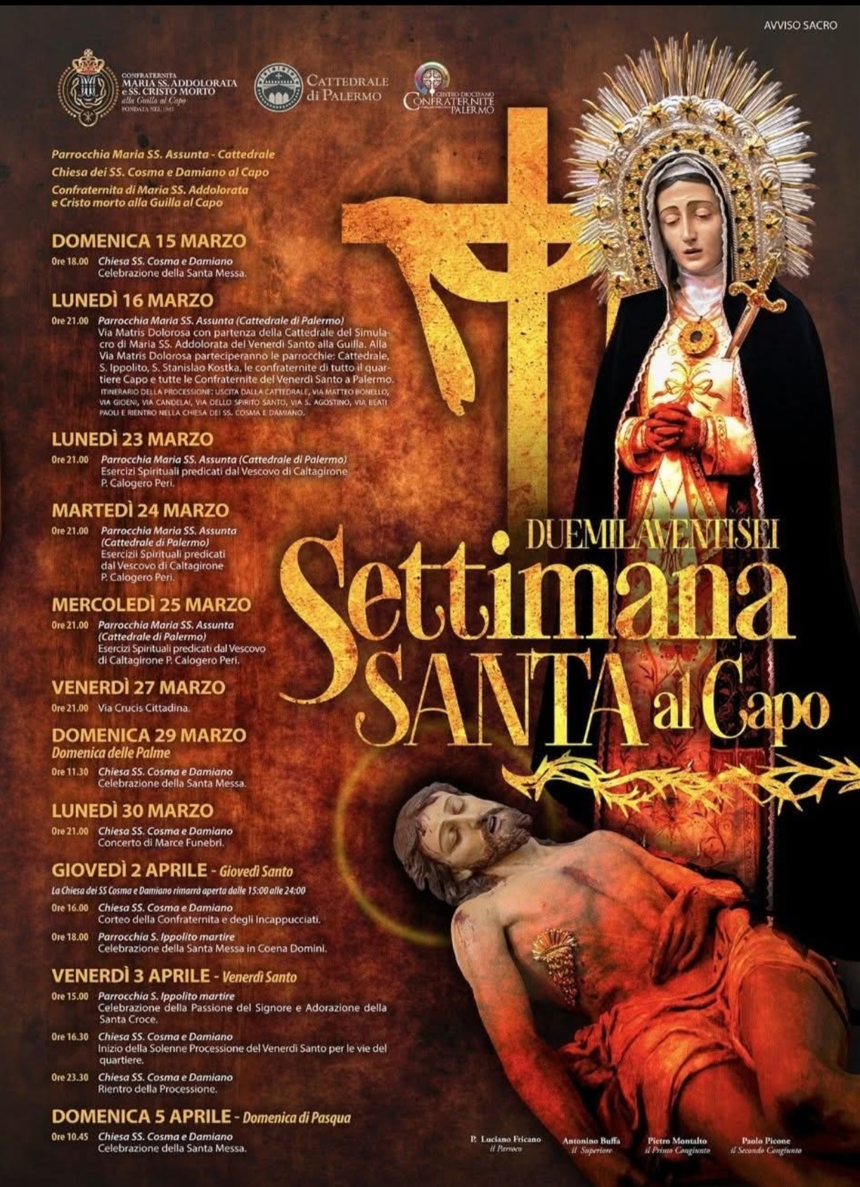 - Processione della Confraternita di Maria SS Addolorata e Cristo morto del Venerdì Santo al Capo (Chiesa dei SS. Cosma e Damiano – Piazza Beati Paoli) dalle ore 16:30