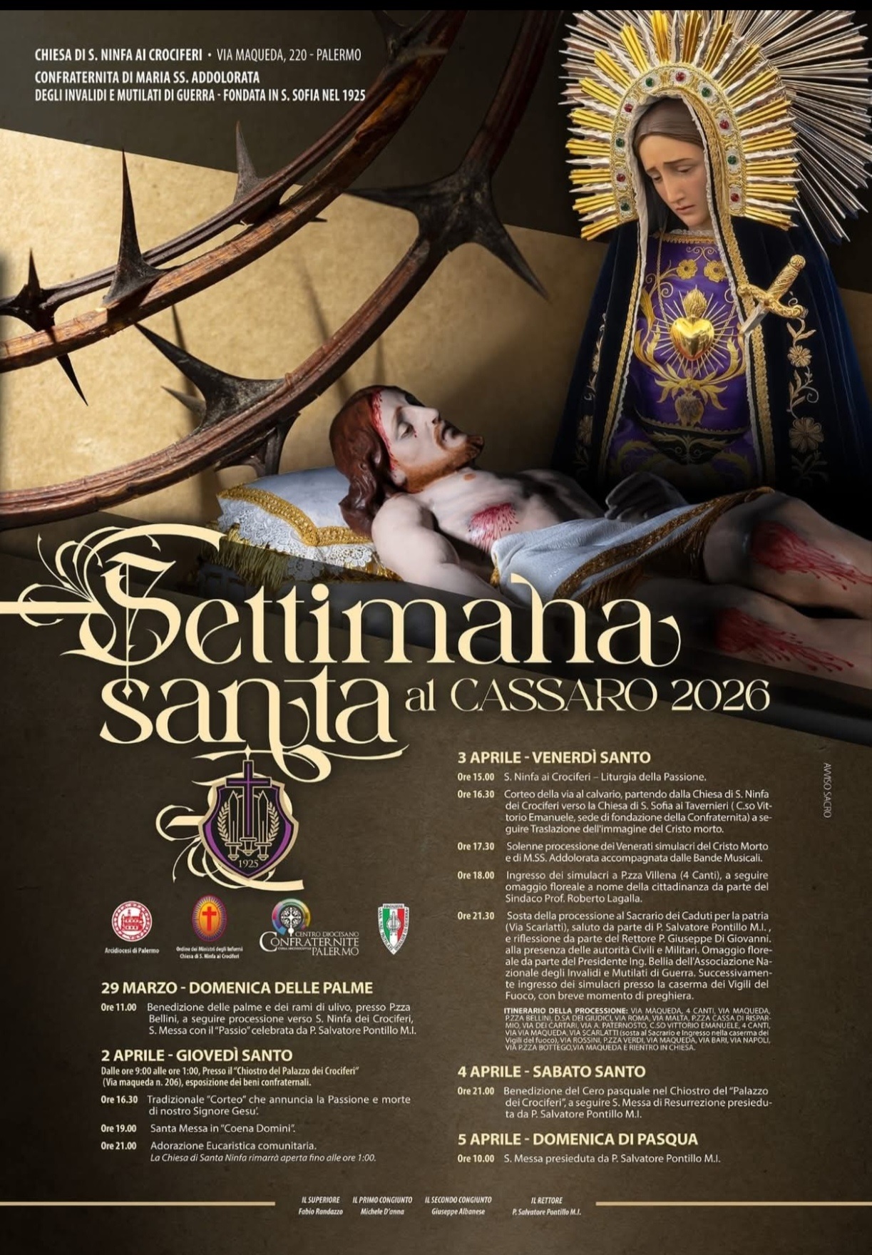 - Processione della Confraternita di Maria SS Addolorata degli Invalidi e dei Mutilati di Guerra (Chiesa di S. Ninfa ai Crociferi – Via Maqueda, 220) dalle ore 17:30