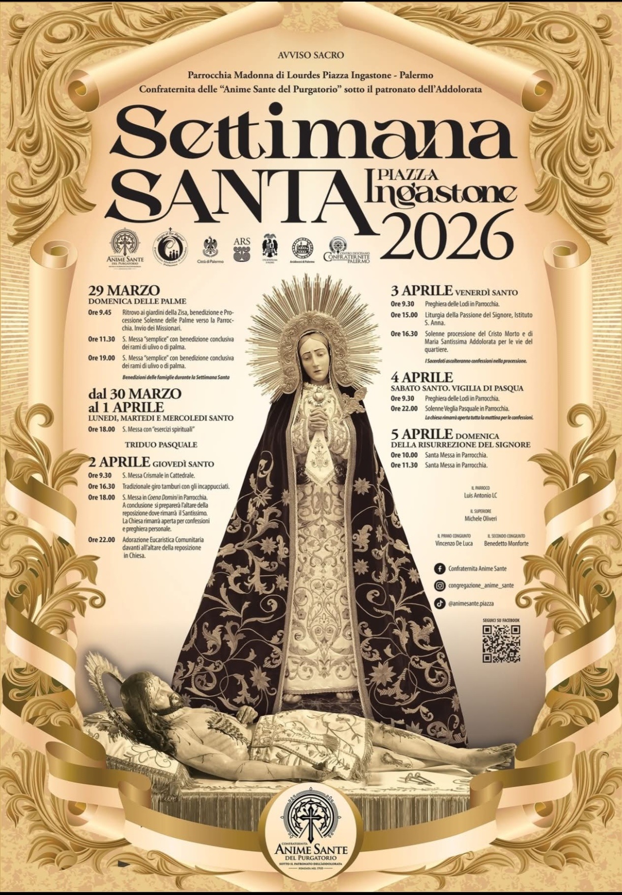 - ore 09:30 - Chiesa di S. Maria della Pietà (Piazzetta della Pietà) - commemorazione dell'ingresso del Signore a Gerusalemme, benedizione degli ulivi e delle palme a Piazza Kalsa, processione verso la chiesa parrocchiale e celebrazione della S. Messa.